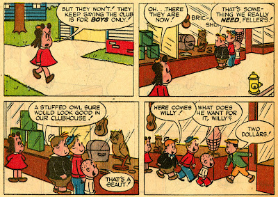 Stanley cares far less about detailed settings, as a writer-cartoonist, than do his collaborators. Irving Tripp (seen above, in the Lulu sequence) and Bill Williams (below, in an example from Dunc 'n' Loo) who endow the fictive-real worlds of John Stanley with solid, substantial detail:
